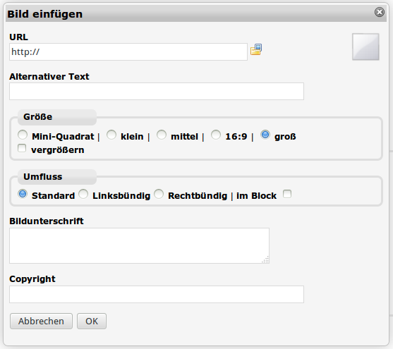 Hier kann im Zweifelsfall unter URL die Adresse eines beliebigen Bildes angegeben werden. Allerdings ist man auf der sicheren Seite, wenn man ausschließlich Bilder aus der eigenen Datenbank verwendet. Um ein Bild aus der Datenbank auszuwählen klicken Sie auf das Icon