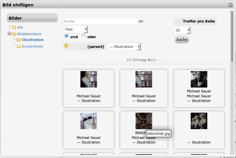 Im Bildassistenten können Sie nun aus der Bilddatenbank das gewünschte Bild auswählen. Dazu können Sie im linken Bereich bei Bedarf durch die angelegten Mappen surfen oder die Suche verwenden.