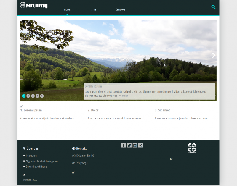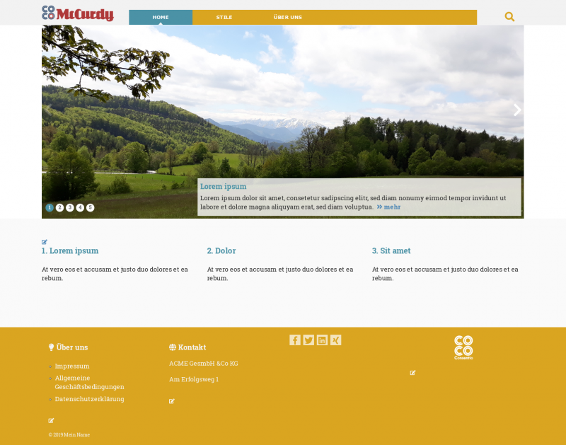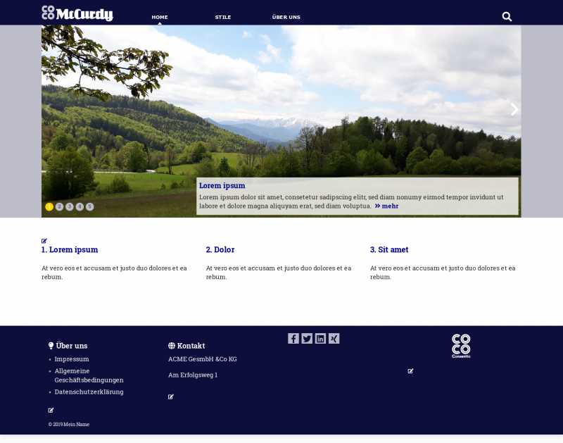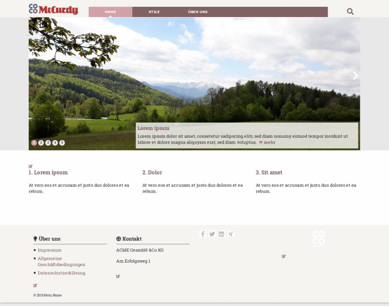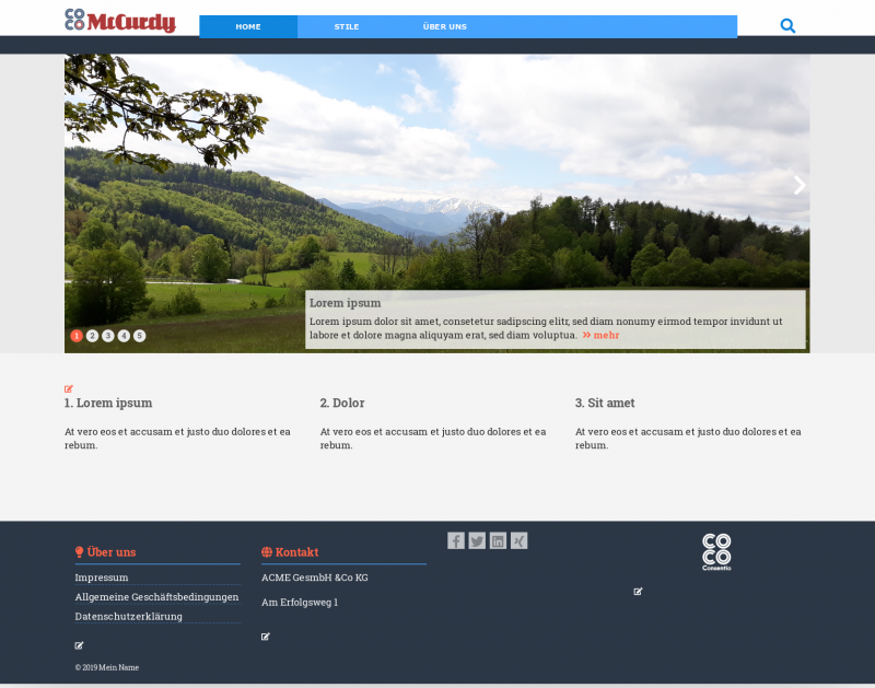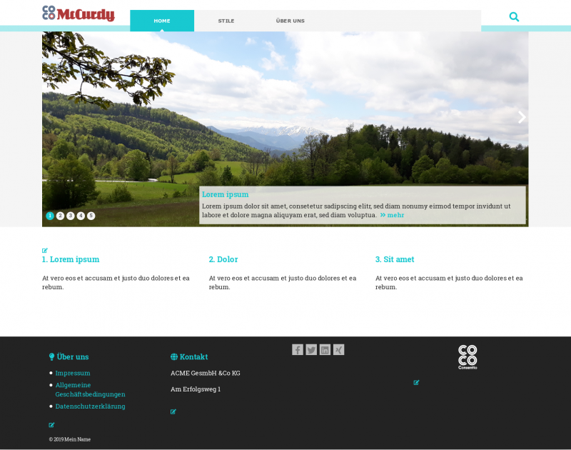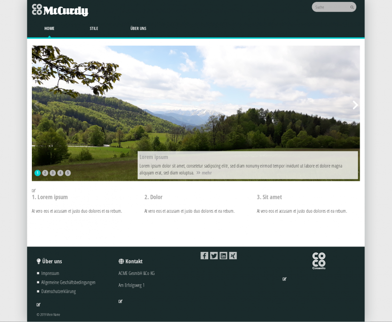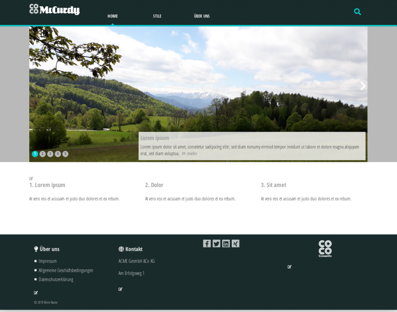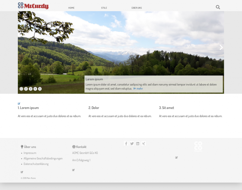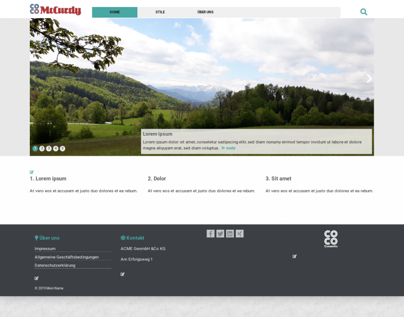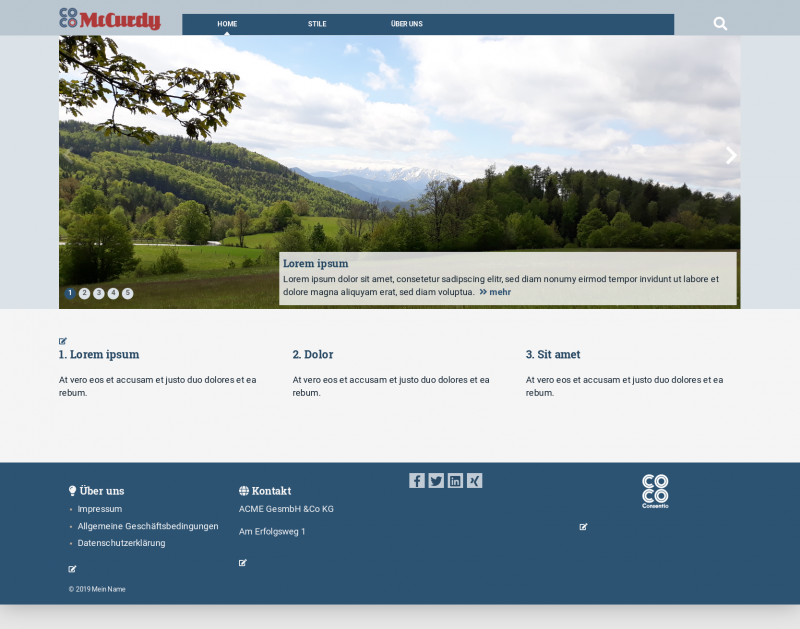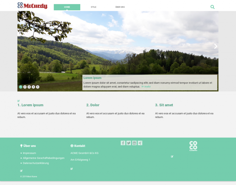 Die Beispiele sollen eine Vorstellung geben, wie die einzelnen Designs wirken. Wobei ein gewöhnliches Setting für eine Startseite gezeigt wird, die aus einem Karussell (kann auch eine Emotionsbild sein) und einem verkürzten Content-Bereich besteht.