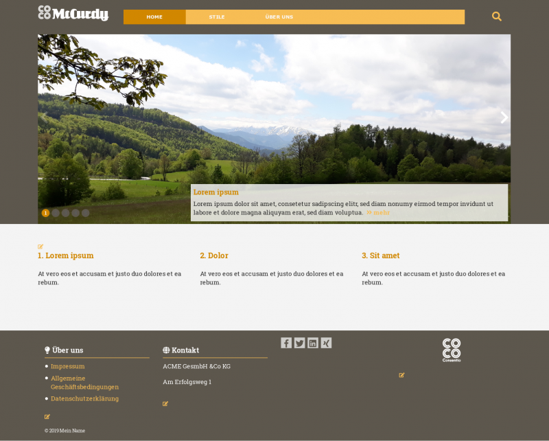 Consentio hat seit Version 3.1 standardmäßig 17 Stylesheets und mehrere gängige HTML-Vorlagen für den Seiten-, Header- oder Footer-Aufbau. So kann im Kopfbereich der Hauptmenüleiste mal mehr oder weniger Raum zugeteilt werden, oder die Seitenaufteilung im Desktop-Bereich modifiziert werden. Alle Design-Varianten sind selbstverständlich responsive – passen sich also den End-Geräten perfekt an.
